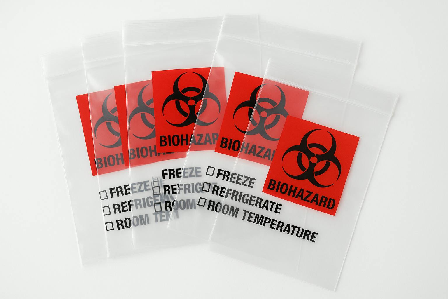 Sacchetti per trasporto campioni che riducono i rischi di infezione nella manipolazione e nel trasporto di campioni biologici, sono provvisti di scritta e simbolo “Biohazard” in conformità al Decreto L.vo 493/96 e alla norma UNI EN ISO 7010.